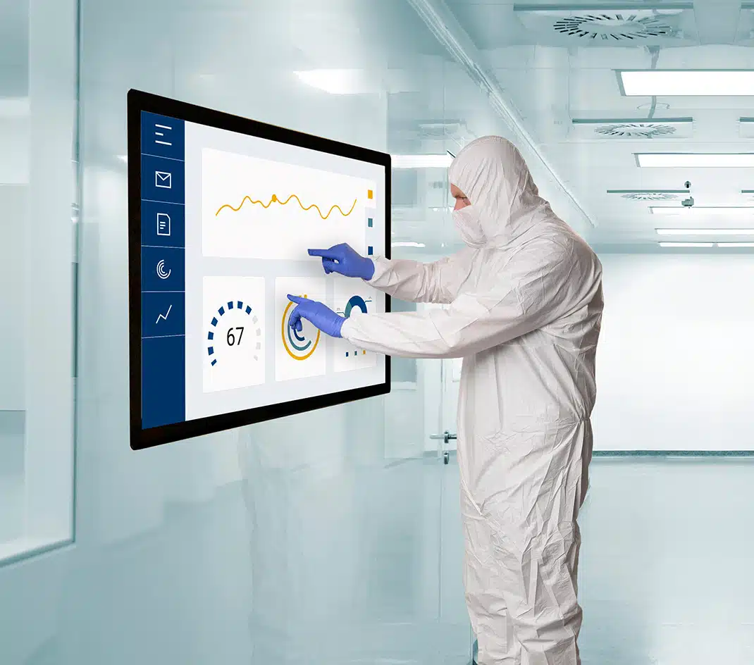 Integration in-wall or rear mount. Suitable for many industries and customisable according to application and environment. Projected capacitive touch can be operated with gloves. True flat front easy to clean.